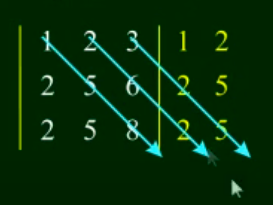 }3x3 (Regra de Sarrus)A Regra de Sarrus consiste em adicionar a 1º e a 2º coluna para o lado direito da matriz determinante e traçar diagonais(a partir dos números da primeira LINHA), exemplo: